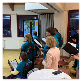 Nach dem gemeinsamen Singen mit unserem Chor und der Einladung zu Kaffee und Kuchen entstand ein reger Austausch mit unseren Fachkräften und den Projektteilnehmenden. Bestaunt und besonders positiv diskutiert wurde die Fotopräsentation der Höhepunkte des Jahres – von Kulturhauptstadtmarathon bis Schichtwechsel sowie die Abschlussarbeit unseres gemeinsamen Projektes mit der Fakultät Angewandte Kunst Schneeberg der Westsächsischen Hochschule.