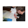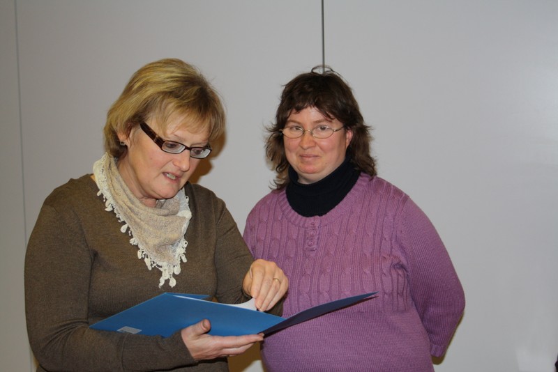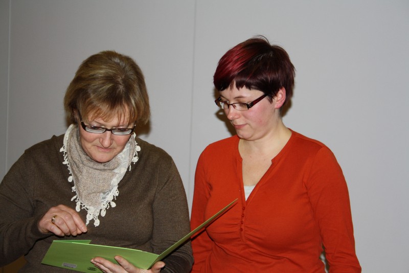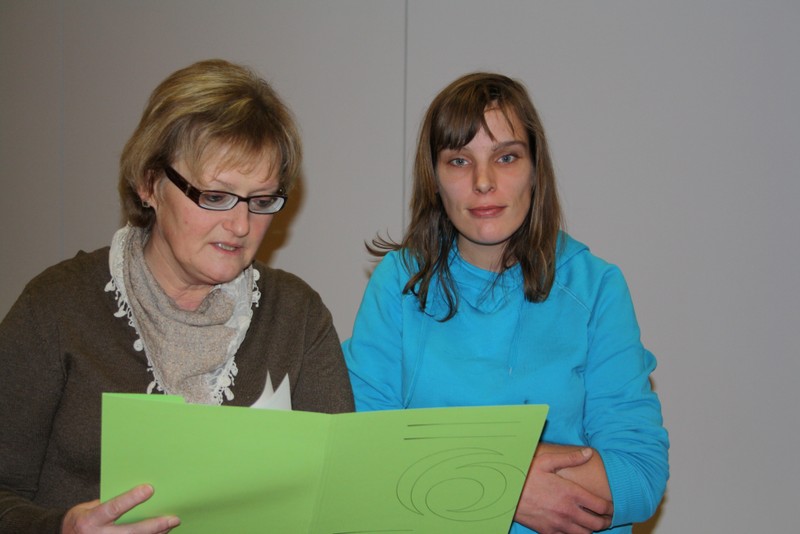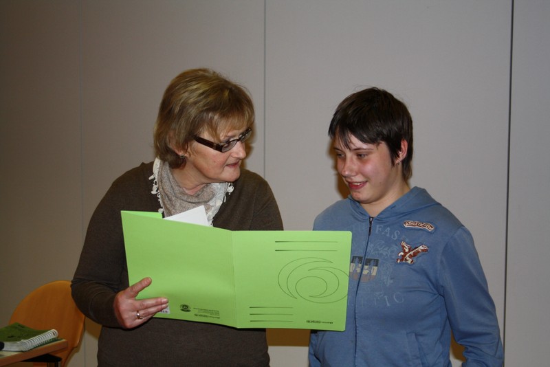Untermalt wurden die Worte durch eine Diashow, in der die 2jährige Ausbildungszeit, angefangen von einem Erste- Hilfe Lehrgang und weiteren Inhalten des Sachkundeunterrichtes, über den Durchlauf der einzelnen Fachbereiche (Hauswirtschaft, Holzbearbeitung, Metall- und Gartenbau sowie Montage/Verpackung) bis hin zu gemeinsamen Exkursionen und Projekttagen, in Bildern festgehalten wurde.