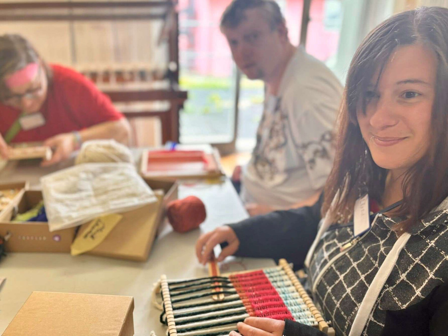 Das erste Kennenlernen zwischen den Studierenden der Hochschule Zwickau und den Teilnehmer*innen der Invitas-Projektgruppe fand statt während eines Besuches der Sonderausstellung „Schneeberger Geflecht“ in den Kunstsammlungen Chemnitz. Emilie Spengler als projektbetreuende Studentin hat durch die Ausstellung geführt. Zusammen wurden die Exponate der Ausstellung ausgiebig angeschaut, teilweise auch ausprobiert. So haben alle Projektteilnehmer*innen am großen Webrahmen bunte Stoffe eingewebt und damit das erste Mal die Technik des Webens erprobt. Es gab anregende Gespräche über Kunst, Kreativsein und eigene Hobbys.