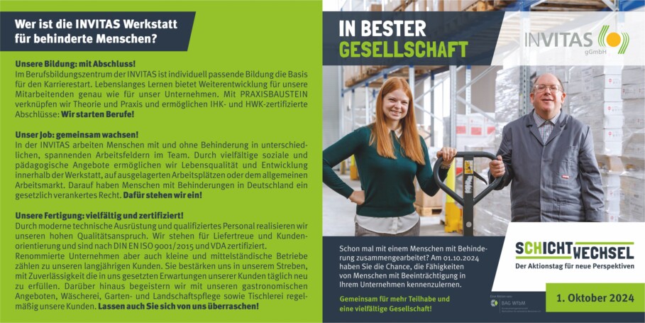Die Mitarbeitenden der INVITAS arbeiten täglich dafür, dass Menschen mit Behinderungen vielfältige Möglichkeiten haben, ihr Leben aktiv und selbstbestimmt zu gestalten. Mit Angeboten in den Bereichen berufliche Bildung, Arbeit, Freizeit, Wohnen und Betreuung für Menschen mit Schwerst- und Mehrfachbehinderungen befähigen und unterstützen wir Menschen dabei, selbstbewusst und mutig ihren eigenen Weg zu gehen.